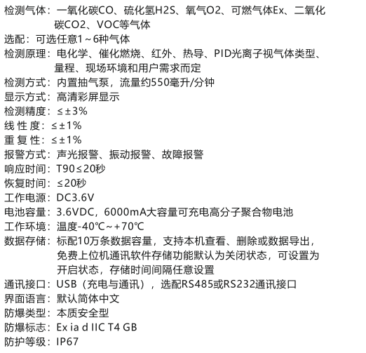 防護(hù)級別IP67,本安電路設(shè)計(jì),防爆、防震,抗靜電,抗電磁干擾:·采用國際著名品牌氣體傳感器,高靈敏度及穩(wěn)定性好;可擴(kuò)展到6種氣體同時(shí)檢測;